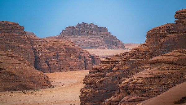 تجمع إطلالة هيسما بين مساحات صحراوية شاسعة وتكوينات جبلية في مشهد متصل. تمتد الكثبان الرملية الطويلة أفقياً عبر الأرض، بينما ترتفع التكوينات الصخرية عمودياً بجانبها. يخلق هذا التباين مشهداً متوازناً. يُظهر المشهد كيف تتصل السهول الصحراوية بالسلاسل الجبلية، مقدماً مثالاً واضحاً على التنوع الجغرافي لمدينة تبوك.