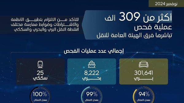 هيئة النقل تعلن عن أكثر من 300 ألف عملية تفتيش لخدمات النقل في نوفمبر 2024