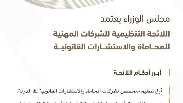 كما أقرّ مجلس الوزراء لائحةً لمكاتب المحاماة والاستشارات المهنية، تهدف إلى تعزيز البيئة القانونية من خلال تنظيم الممارسات وفق أفضل المعايير. ويحدد الإطار شروط تأسيس المكاتب، ومتطلبات الترخيص، وآليات الرقابة، ومسؤوليات الشركاء. ويضمن ذلك الاحترافية والشفافية، وبيئة عمل قانونية تلبي احتياجات السوق، مع تعزيز كفاءة القطاع.