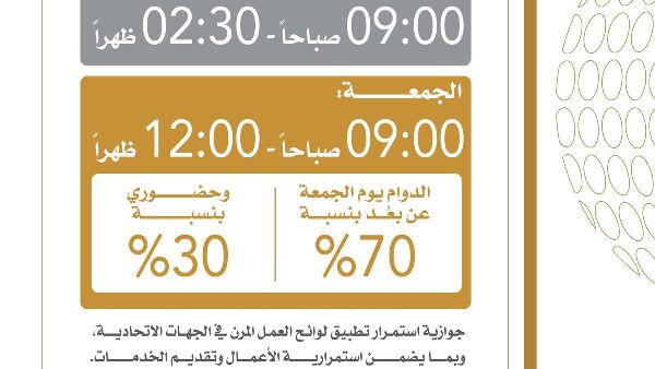 ووفقاً للتعميم الصادر، سيبدأ يوم العمل في الساعة 9:00 صباحاً وينتهي في الساعة 2:30 بعد الظهر من الاثنين إلى الخميس. تم تحديد ساعات عمل أقصر في أيام الجمعة، بحيث تبدأ من الساعة 9:00 صباحًا وتنتهي عند الساعة 12:00 ظهرًا. ينطبق تعديل الجدول الزمني هذا باستثناء الأدوار التي تتطلب بنية مختلفة لساعات العمل بسبب طبيعة العمل.