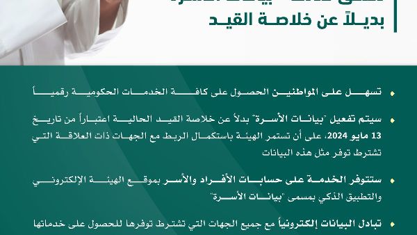واعتباراً من 13 مايو 2024، سيتمكن الأفراد والأسر الإماراتية من الحصول على بياناتهم من خلال خدمة مخصصة على موقع الهيئة الإلكتروني والتطبيق الذكي. وستشهد هذه الخطوة إيقاف وثيقة دفتر العائلة الحالية، لتحل محلها "بيانات العائلة" الرقمية للوصول إلى الخدمات المختلفة. وسيشمل النظام الجديد جميع المعلومات التي سبق تسجيلها في دفتر العائلة، بما في ذلك الجنسية والبيانات العائلية ومكان الميلاد. ومع ذلك، ستظل جوازات السفر بمثابة الوثيقة الأساسية للسفر الدولي.