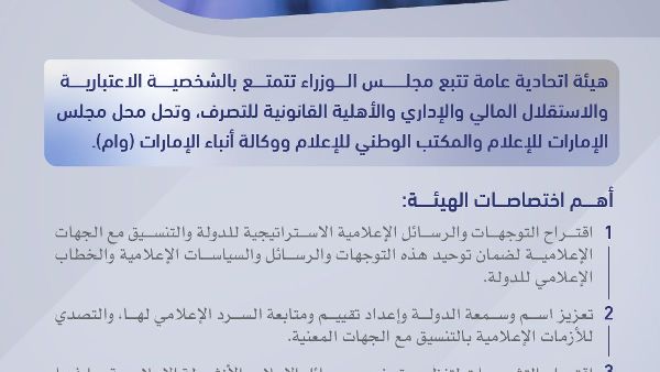 أصدرت حكومة دولة الإمارات العربية المتحدة مرسوماً وقانوناً اتحادياً بإنشاء الهيئة الوطنية للإعلام، وهي هيئة عامة اتحادية تابعة لمجلس الوزراء. وتحل الهيئة الجديدة محل هيئات إعلامية اتحادية قائمة، وتتولى مهمة توحيد الرسائل والسياسات الإعلامية في جميع أنحاء الدولة، ودعم سرد إعلامي إماراتي متسق محلياً ودولياً.
