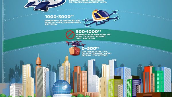 يجري حاليًا استكشاف تكوين عمودي متعدد الطبقات للمجال الجوي لمنع تداخله مع مجرى الهواء. ويشمل هذا التكوين مناطق تتراوح بين صفر و٥٠٠ قدم لعمليات الطائرات بدون طيار، ومن ٥٠٠ إلى ١٠٠٠ قدم كمنطقة عازلة، ومن ١٠٠٠ إلى ٣٠٠٠ قدم لمركبات الأجرة الجوية، وأعلى من ٣٠٠٠ قدم للطيران التجاري. يُختبر هذا الهيكل من خلال عمليات محاكاة تُحلل تدفقات الرياح حول المباني والتضاريس.
