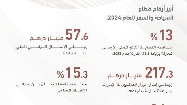 أفاد المجلس العالمي للسفر والسياحة (WTTC) أن قطاع السفر والسياحة في دولة الإمارات العربية المتحدة حقق نموًا ملحوظًا في عام 2024. وبلغت مساهمة القطاع في الناتج المحلي الإجمالي للدولة 257.3 مليار درهم إماراتي (70.1 مليار دولار أمريكي)، أي ما يعادل 13% من الاقتصاد. ويمثل هذا زيادة قدرها 3.2% عن عام 2023، وزيادة ملحوظة قدرها 26% مقارنة بمستويات ما قبل الجائحة في عام 2019.