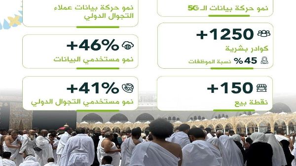 وشهدت الشركة زيادة بنسبة 86% في عدد مستخدمي شبكة 5G وزيادة بنسبة 45% في حركة بيانات 5G خلال موسم الحج. بالإضافة إلى ذلك، نمت سعة نقل البيانات بنسبة 325%، مما أدى إلى نمو بنسبة 79% في إجمالي حركة البيانات وزيادة بنسبة 72% في بيانات التجوال الدولي.
