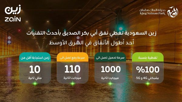 أطلقت شركة زين السعودية تغطية متقدمة لشبكات الجيلين الرابع والخامس في نفق طريق أبو بكر الصديق بالرياض. يُعد هذا النفق، الذي يمتد بطول 2430 مترًا، من أطول الأنفاق في الشرق الأوسط، ويمر عبر حديقة الملك سلمان من الشمال إلى الجنوب. تهدف هذه المبادرة إلى تعزيز البنية التحتية الرقمية من خلال توفير شبكة اتصالات مستقرة وسريعة داخل النفق.