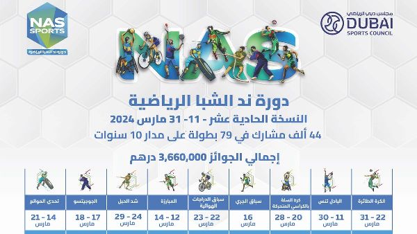 وشهدت دورة ند الشبا الرياضية، على مدار عقد من الزمن، مشاركة أكثر من 44 ألف رياضي عبر 79 بطولة رياضية. وتنطلق نسخة هذا العام ببطولة الباديل، والتي تستمر حتى 30 مارس الجاري، وتتضمن بطولة دولية تستقطب اللاعبين من مختلف أنحاء العالم.